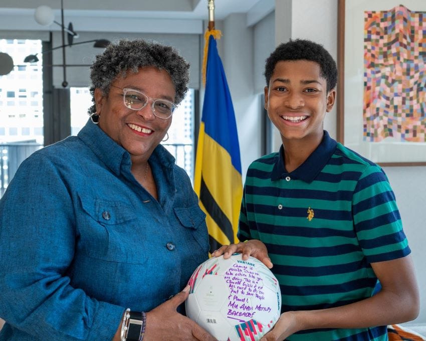 The following day, Sunday, September 21, was a proud moment for Prime Minister Mottley when she was invited to sign the climate change soccer ball by a 15-year-old high school student from California, Ismachiah Oduwole, at The Fifty Sonesta Hotel, in Manhattan.